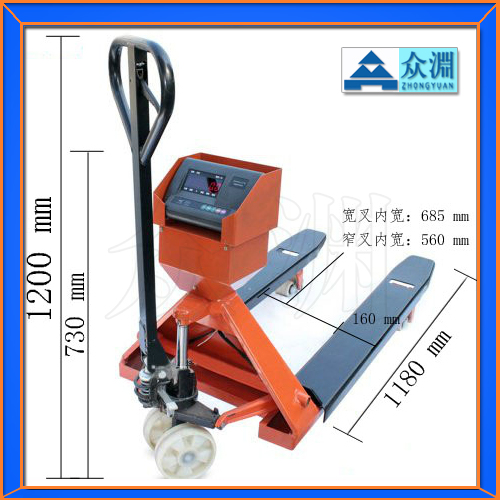 电子叉车称标准配置:液压升降手动搬运车(材质有碳钢可选304全不锈钢结构),高精度悬臂梁式(压脚式)称重传感器,XK3190系列**交直流两用,全不锈钢**浪涌接线盒,****液压升降系统